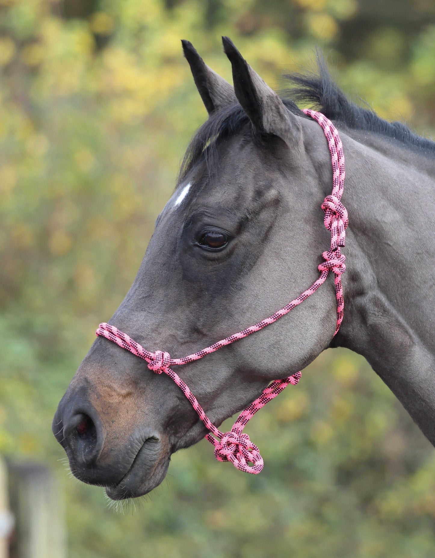 Lightweight and simple to fit. Useful where more control is required as the halter tightens when the horse leans into it, which encourages lightness. Not recommended for use when tying the horse up, as there are no break points. Ensure the halter is fitted with about a fingers width gap between the rope and the head to prevent it becoming tangled.