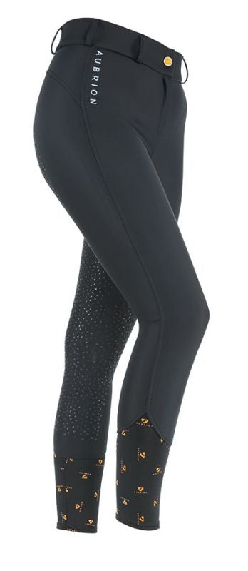 Winter riding breeches made from warm fleece lined fabric with a water resistant smooth outer, ideal for smart or casual wear. Style detail: full silicone grip seat, small inner waist key pocket, stretch lower leg cuffs, belt loops, Aubrion prints.