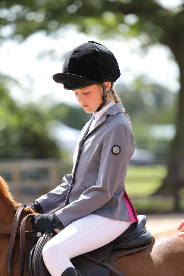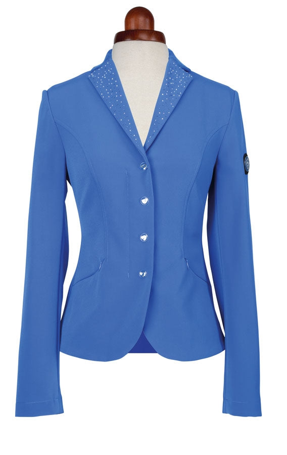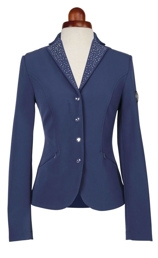 Sparkle in the show ring with this sleek jacket featuring diamante detailing. Style detail: tailored for a slim fit, shorter length, stretch quick dry fabric, suede collar trim with iridescent diamantes, two concealed zip pockets, contrast suede trim rear vents, zip fastening concealed by popper button placket, contrast mesh lining for cool comfort, Aubrion emblem.