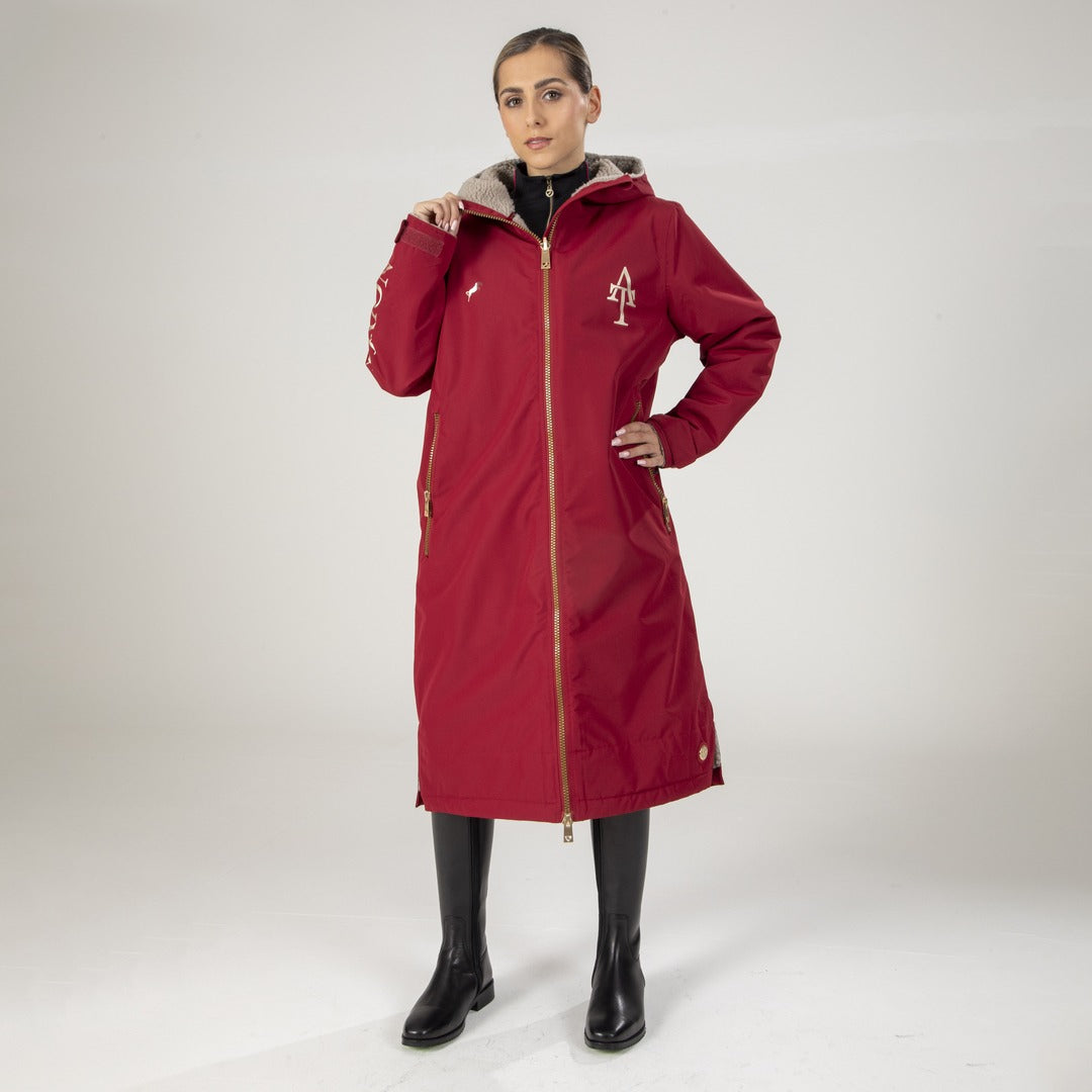 The ultimate winter layer gets the Aubrion Team treatment, bringing a luxe feel to the all weather robe. Waterproof, breathable and lined with borg fleece to ensure the weather is kept out. A two way front zip and rear riding vent offers flexible wear in or out of the saddle. The detail: roomy fit, calf length, grown on hood, two way front zip, hidden rear vent, two outer zip pockets, one inner zip pocket, cuff adjusters, lower hem emblem badge, Aubrion Team prints. Outer fabric waterproof rating: 5000mm with breathability rating 5000g/m2/24h. DWR (durable water repellent) finish causes moisture to shed, bead up and roll off the outer surface of the garment to help maintain breathability.