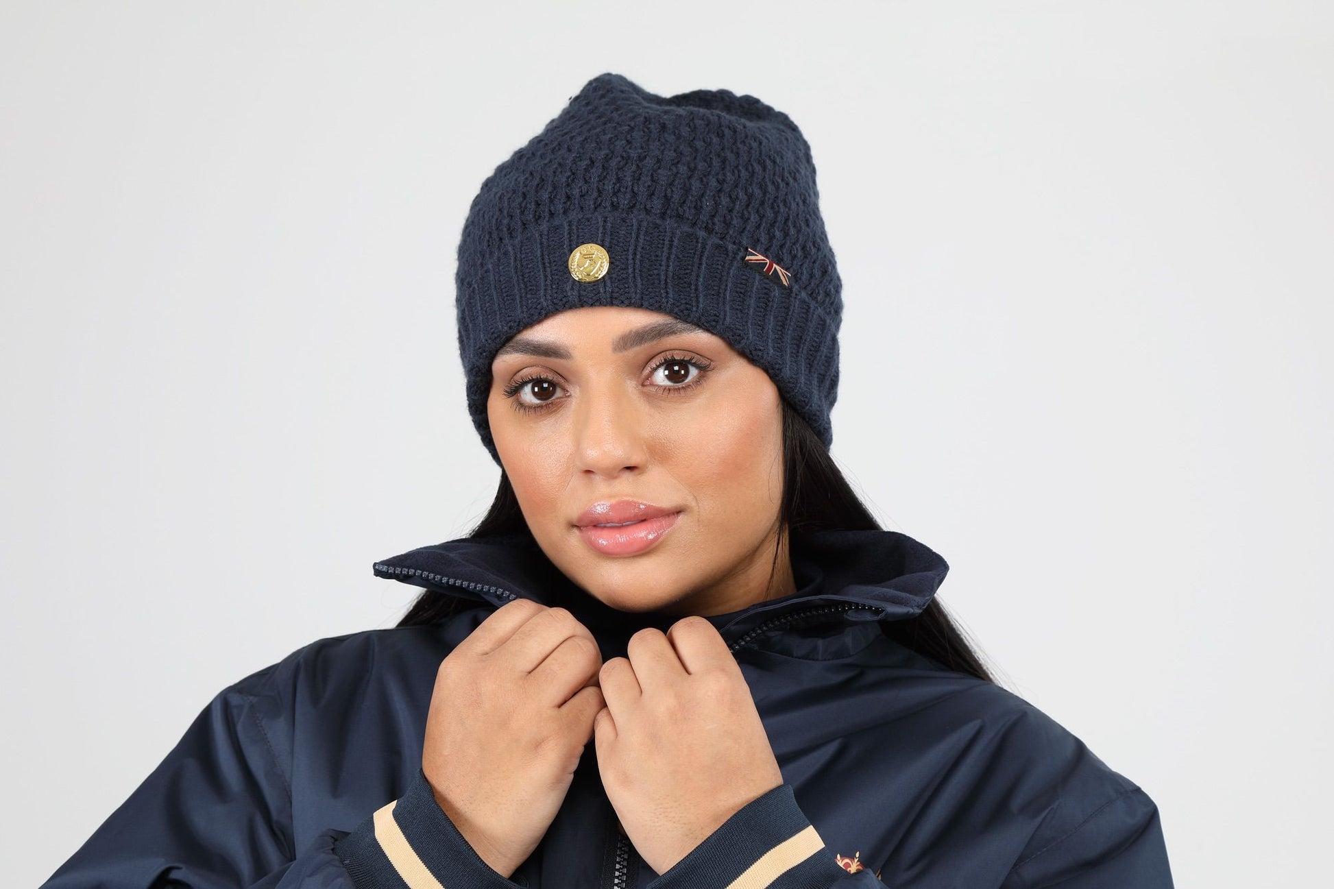 Knitted Aubrion Team beanie, the cold weather hat that insulates with a sense of style. A soft, lightweight knit with turn up hem, Aubrion Team badge and union jack trim.