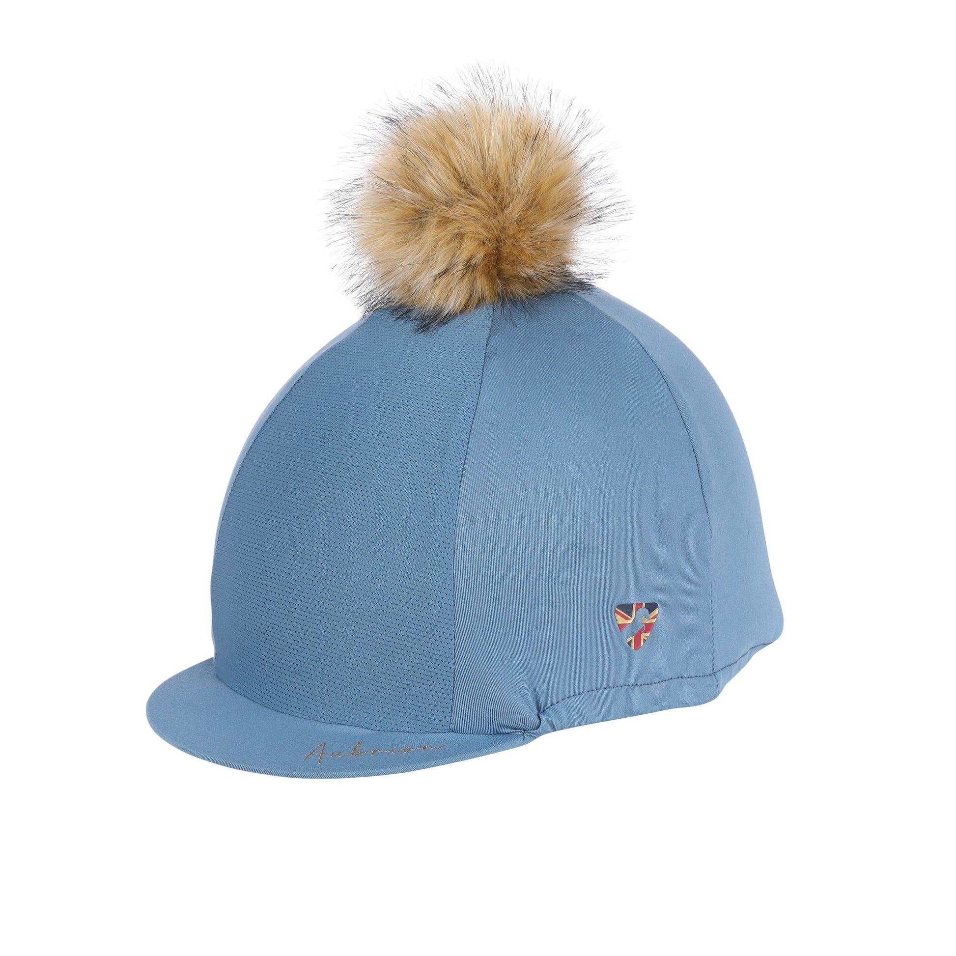 Top off your favourite Aubrion Team outfit with the latest season coordinating hat cover. Featuring Aubrion Team prints and a breathable centre front panel for use with ventilated riding helmets. Contrasting faux fur pom pom.