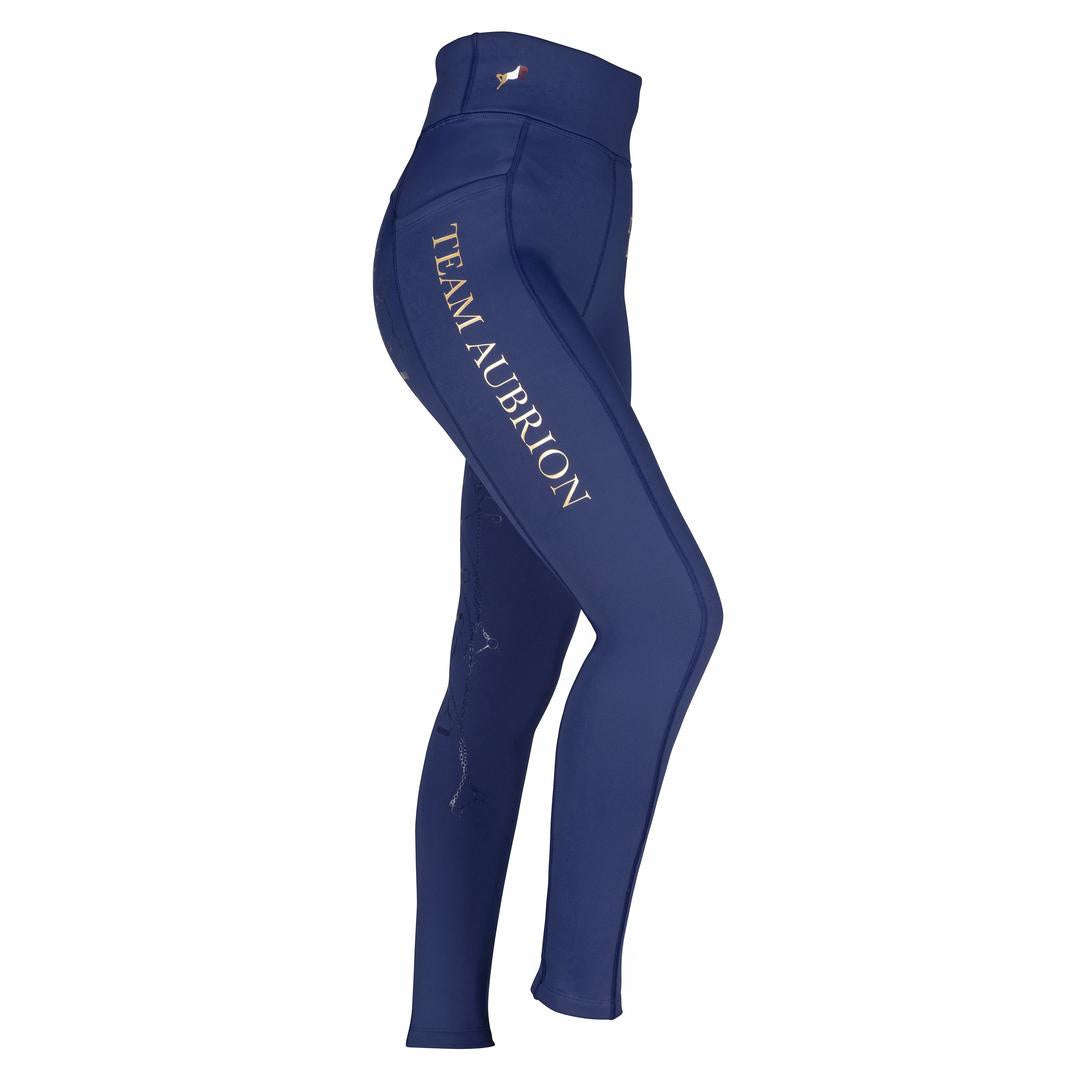 Essential cold weather protection for the legs, Aubrion Team winter riding tights offer warmth with elegant equestrian style, a must for the glamorous rider. Stretchy, quick drying performance is given a winter makeover with the addition of a soft fleecy inner for effective moisture management and thermoregulation. The high waist features a deep band for a supportive and secure fit. The detail: silicone full seat grips, supportive waistband, thigh phone pocket, insulating fleecy inner, Aubrion Team prints.
