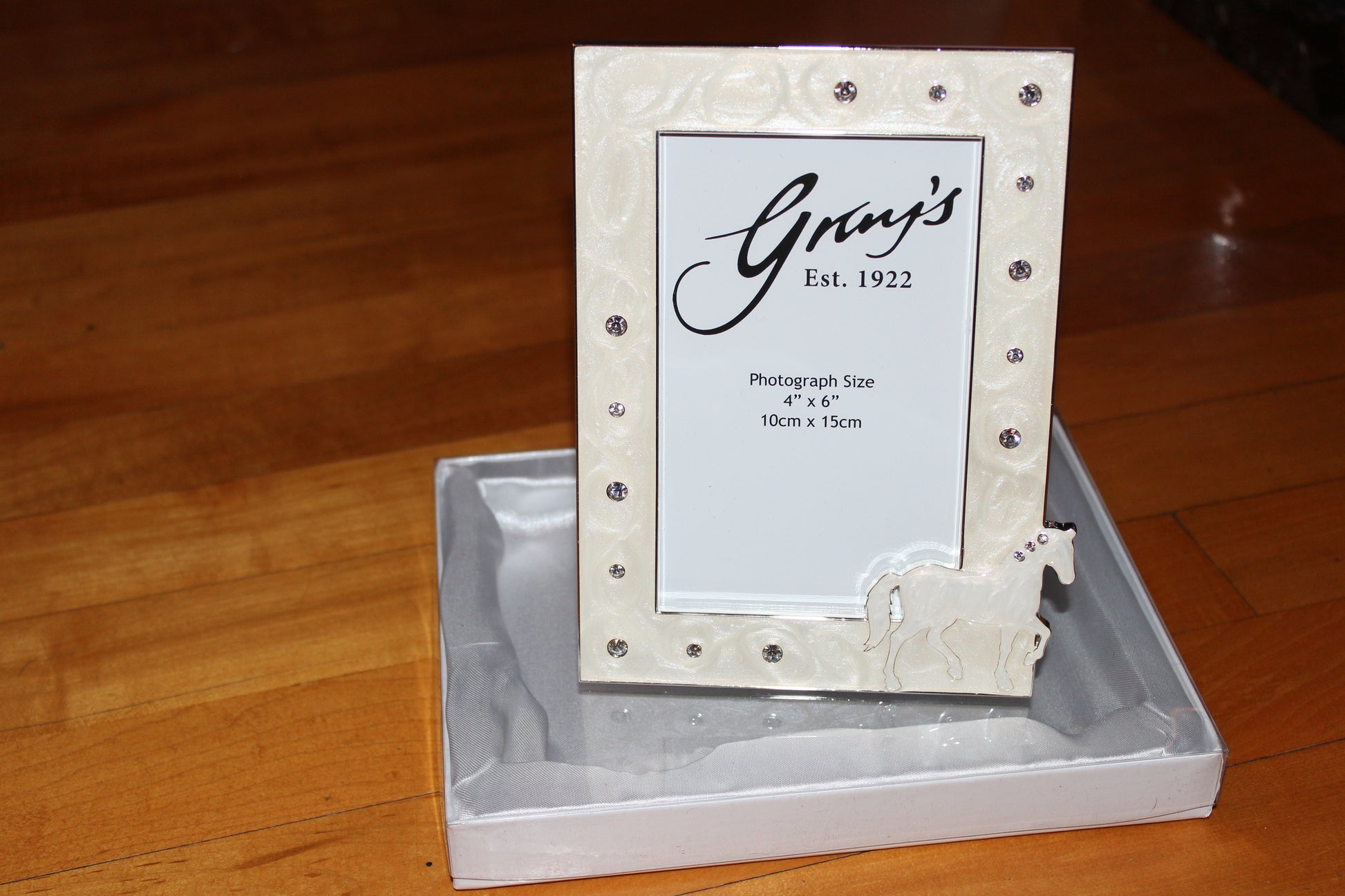 The perfect gift for any horse lover! A frame to put a photo of their best friend in. Or treat yourself and make the photographs of your special horse memories stand out in this stylish cream pearl effect with crystals metal photo frame with a horse in the bottom right corner.