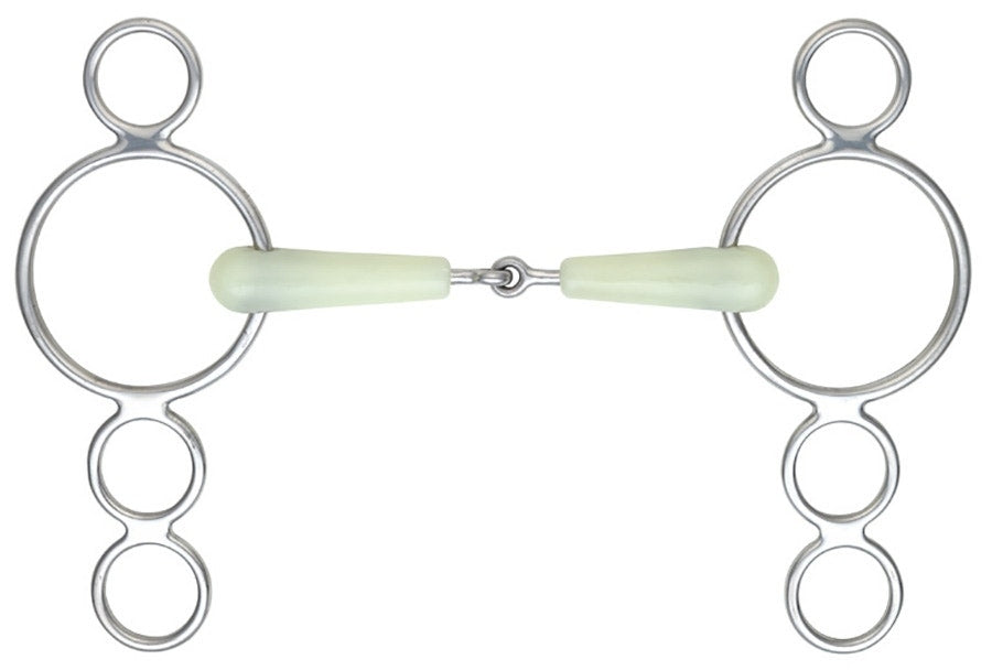 The EquiKind apple flavoured mouthpiece on this bit makes it more comfortable in the horse?s mouth. The three rings cheeks allow leverage. The 5" and smaller sizes of this bit have smaller rings to ensure the bit remains in proportion. Mouthpiece thickness: 18mm. Cheek height: 150mm (4.5", 5"), 180mm (5.5").