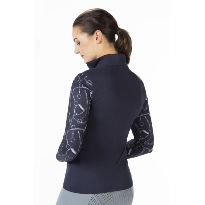 The long-sleeved functional shirt from the Monaco Style collection attracts attention in the stable due to the strong all-over print, which is composed of stirrups, bridles and bites. The small dentition made of rhinestones, applied at chest level, underlines the elegant style of the shirt. The fashionable long-sleeved shirt is cuddly soft, closes with a zipper with a small stand-up collar, and the elastane part ensures very good freedom of movement when riding. Perfect breathability and a very good fit are guaranteed with the elastic functional shirt. Can be ideally combined with other items from the trendy Monaco Style collection.