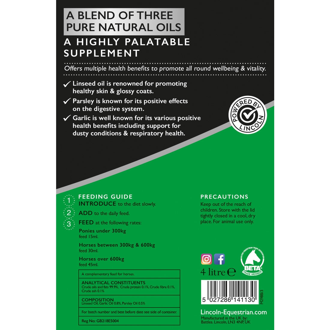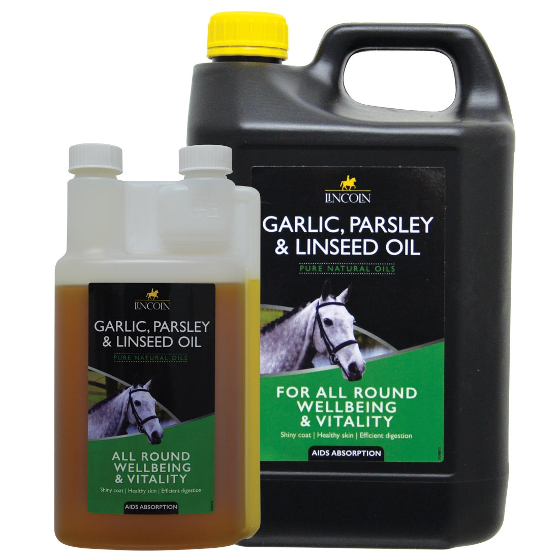 An easily absorbed form of beneficial garlic and parsley in nutritious linseed oil. For all round wellbeing and vitality. Contains pure oils of natural garlic and parsley blended with the nutritional benefits of linseed oil. Garlic is well known as being beneficial for dust allergies sweet itch respiratory conditions and maintaining optimum circulation. Parsley is known for its positive effects on the digestive system. Linseed oil is widely recognised as maintaining good coat and skin condition.