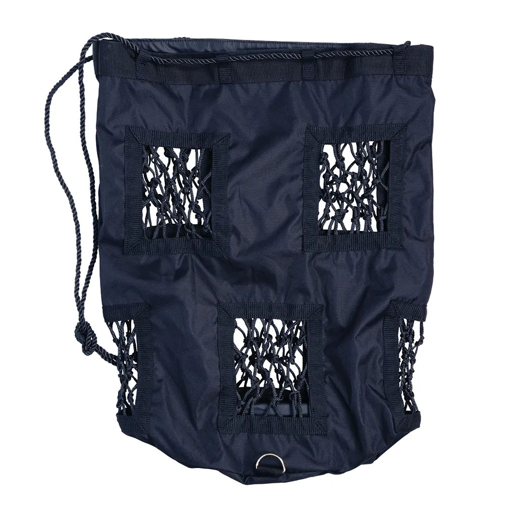 The Slow Flow Fun Play Bag is perfect for greedy feeders, those on a diet or horses that need their ad lib forage controlled - convenient and easy to use, ideal for use in the field, whilst travelling or in the stable. Easy to fill, this hay bag will reduce mess and waste while keeping your horse occupied and features a drawstring for quick and easy hanging and closure. Made from a waterproof, 1680 denier fabric with reinforced rectangular holes covered with individually crafted 4cm holes to slow hay consumption and trickle feed your horse or pony, ensuring better digestion and less waste on the floor. A great enrichment tool.