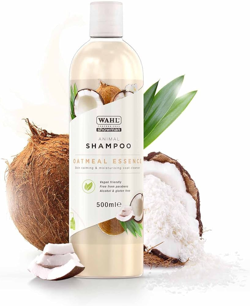 Wahl Showman Oatmeal Essence Shampoo is the perfect shampoo for animals with very sensitive skin. It contains oat proteins to soothe and reduce irritation in the skin, as well as natural coconut extract and almond oil to help moisturise in and condition hair, helping to ease dryness and inflammation at the same time. This gentle shampoo removes dirt, grease and odour from the coat and is suitable for all hair types. With a soft and natural smelling coconut fragrance with a hint of sweetness.
