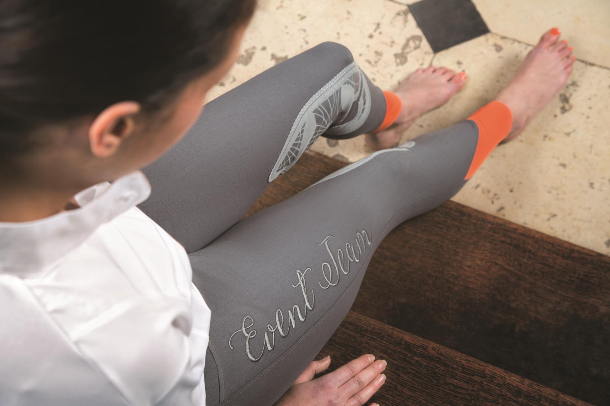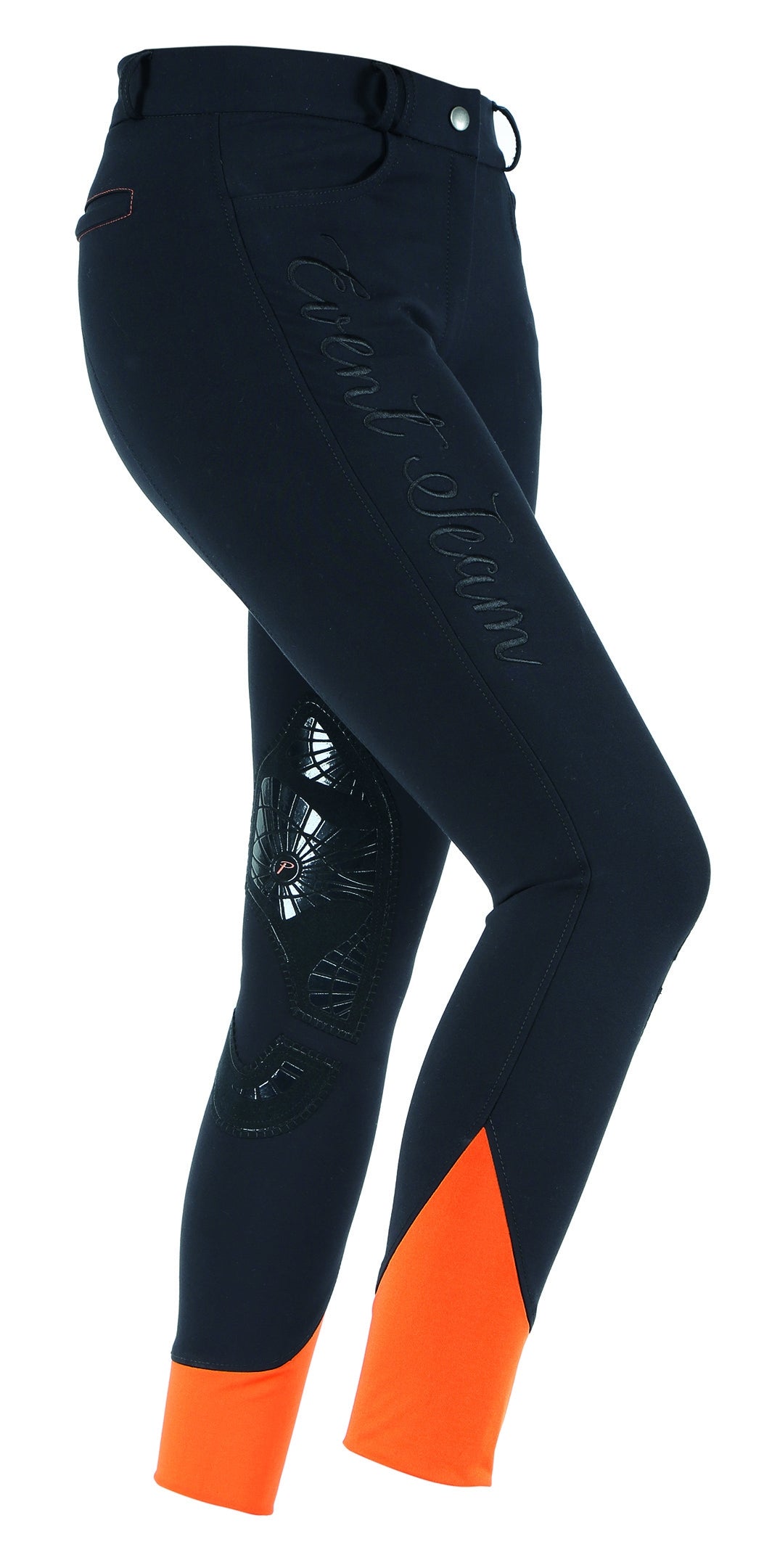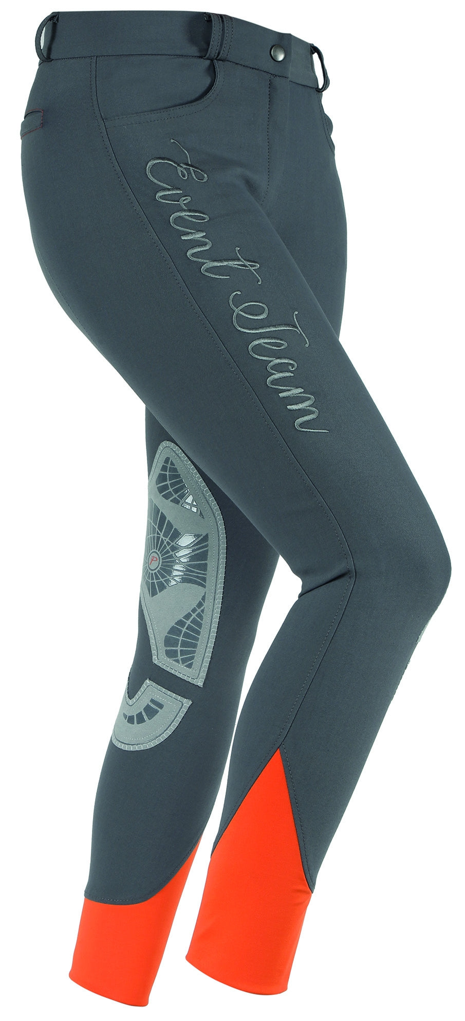 High performing fabrics ensure these sporty breeches keep the equestrian athlete comfortable in the saddle. A self-fabric contour seat, clarino knee patches with silicone gel engineering for extra grip, stretch ankle cuffs and flat lock seams all enhance the rider's experience. Additional features include stylish embroidery, jeans style pockets, belt loops and secure slide button.