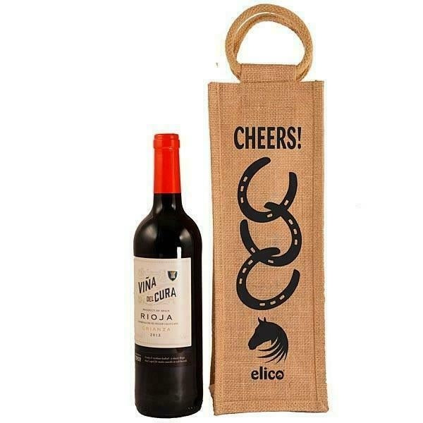 The Elico Jute Bottle bag is the perfect bag for horse lovers! This bag is made with food grade lamination with design printed on both sides. It features a soft padded cotton handle.
