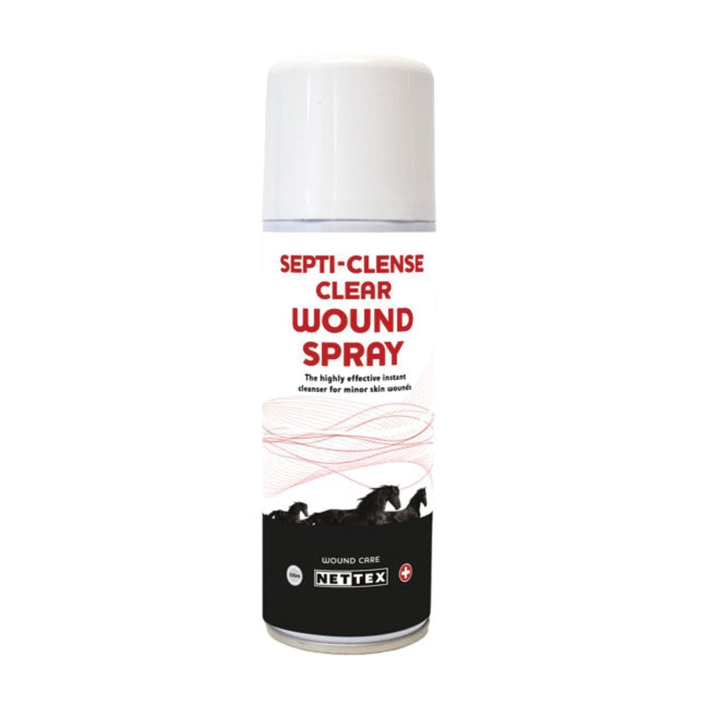 Nettex Septi-Cleanse Clear Wound Spray is a colourless instant cleanser with a powerful antibacterial action designed to aid healing of minor wounds, cuts and abrasions. Ideal to use on wounds during the showing season as does not discolour the colour of the coat.