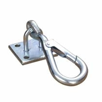 Galvanised steel snap hook on wall plate - great for holding buckets, feed tubs or for attatching onto stable to secured stall guards, etc.
