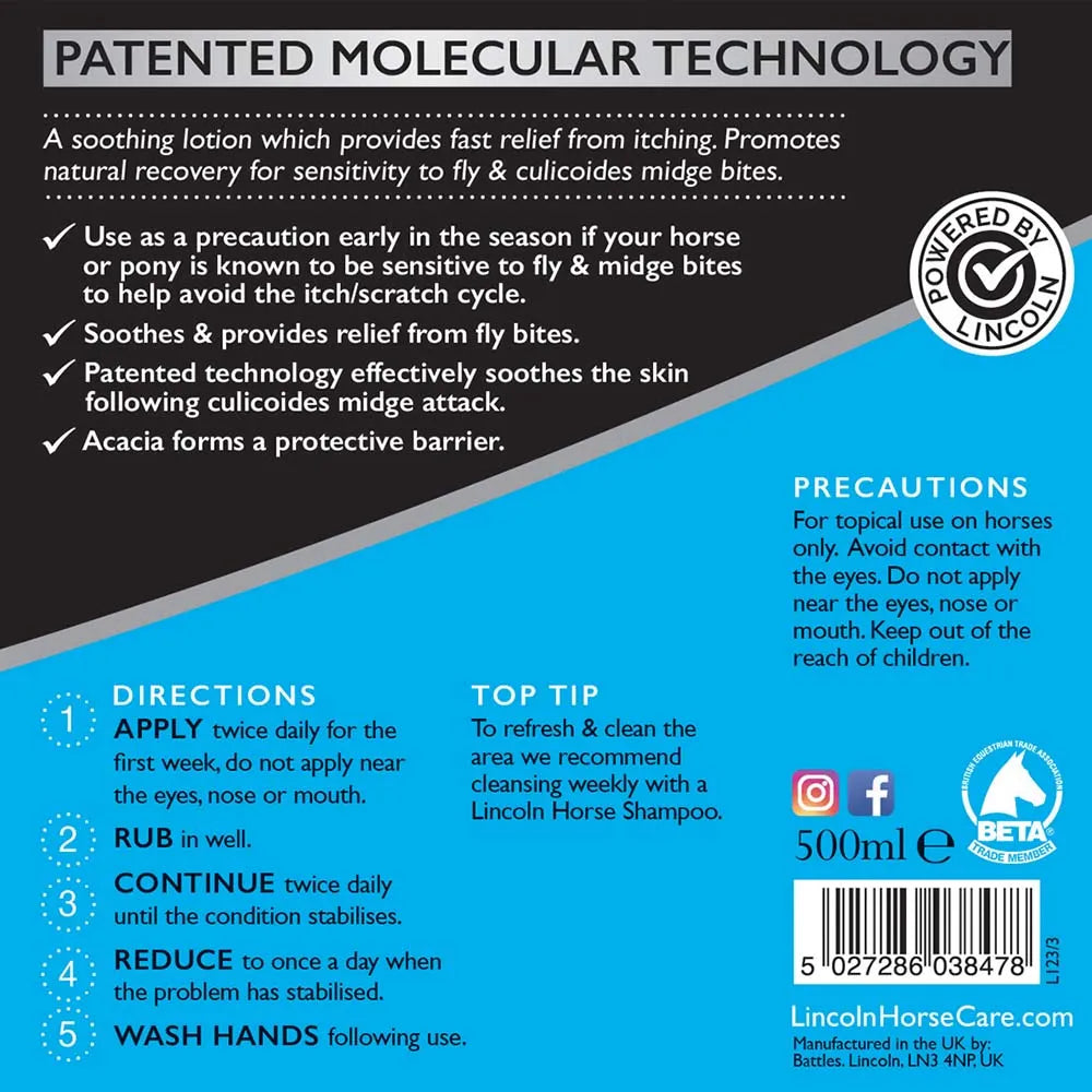 A soothing itch relieving lotion particularly useful before onset, during and for maintaining recovery following a sweet itch attack. Patented molecular technology.