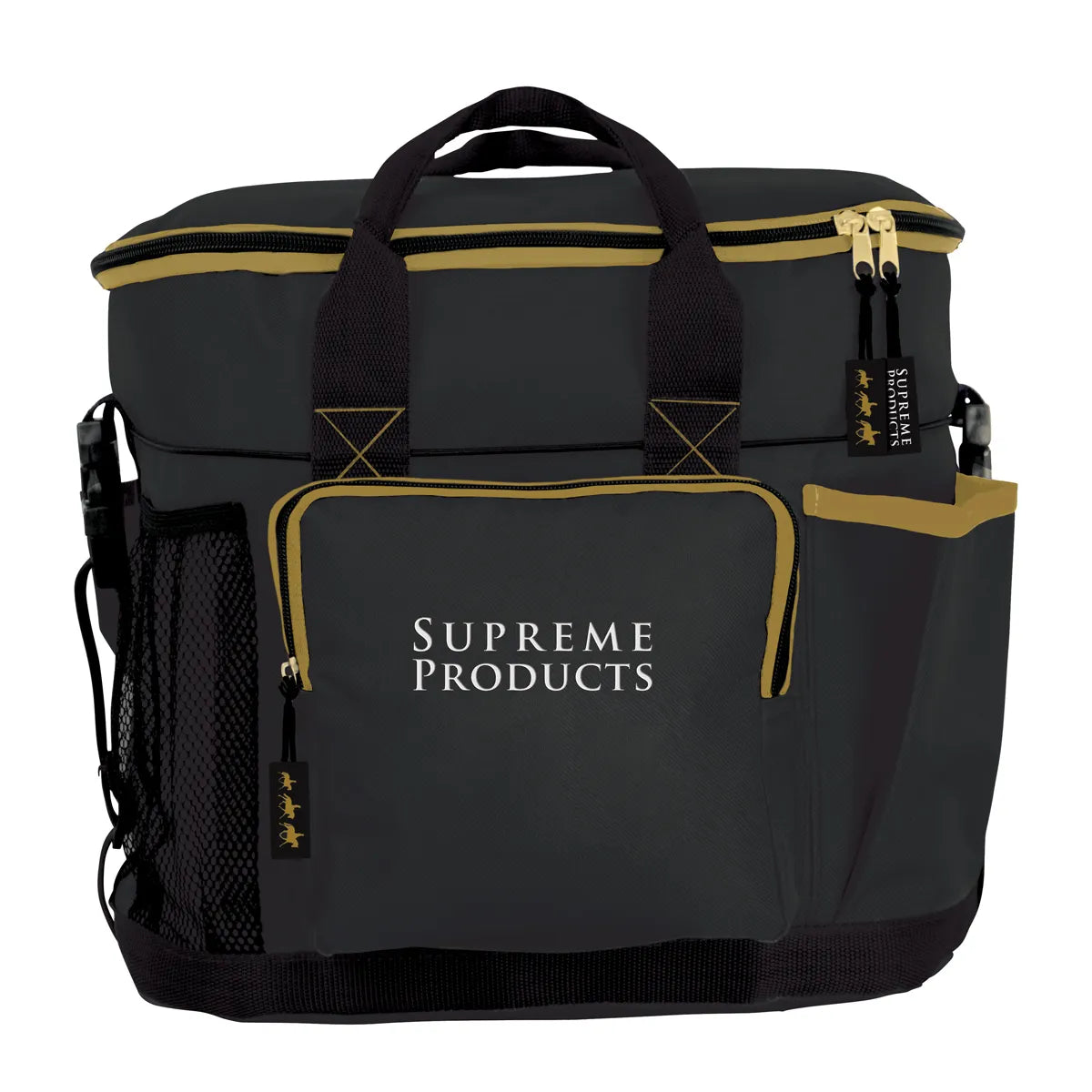 The Supreme Products Pro Groom Ring Bag is ideal for the show ring or for keeping products tidy at home. This classic black bag with elegant gold detailing has multiple pockets and compartments offering plenty of storage space for all those products you may need to hand. Featuring an adjustable shoulder strap and grab handles for ease of carrying.