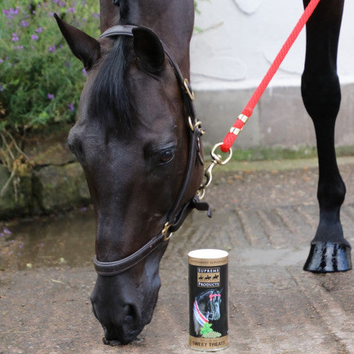 Supreme Products Sweet Treats are deliciously tasty peppermint flavoured treats for horses and ponies. These yummy pocket-sized treats are ideal for taking in the ring as a training reward and come in a cylinder container with a re-sealable lid for extra freshness. Packed with natural goodness, these low calorie treats not only taste great, but come in the perfect 'shaking' container for getting horses ears pricked for a winning photo. Can easily be carried around in your ring basket.