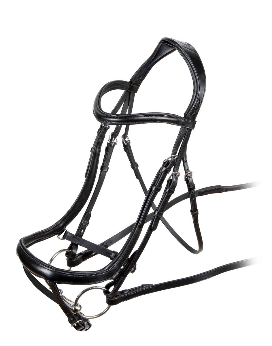 The Velociti Ergonomic 'Curved' Flash Bridle from Shires offers the horse a greater sense of freedom and allows for improved communication. The curved noseband relieves compression from the cheekbones, jaw and sensitive nerve endings. The padded integrated noseband and flash strap give a greater spread of pressure creating a less restricted feeling for the horse.