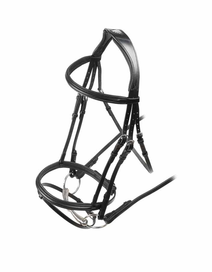 Super smart, this Velociti RAPIDA flash bridle offers padding in all the right places for a comfortable fit. Tech details: FreedomFit headpiece designed to relieve pressure thanks to the wide, cushioned crown with poll gap and cutaway ear profile; soft leather combined with generous, anti-shock padding on the headpiece, browband and noseband; elegant profile due to sleek angled throatlash; high shine stainless steel harness buckles; signature Velociti RAPIDA reins for flexible and assured grip.